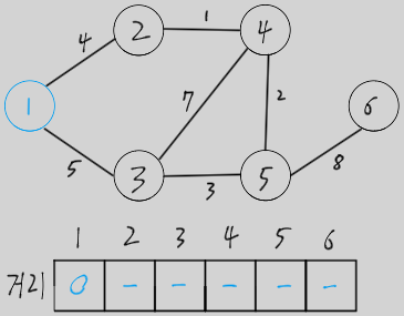 - 모든 노드의 거리를 큰 수로 초기화하고 시작 노드의 거리를 0으로 초기화