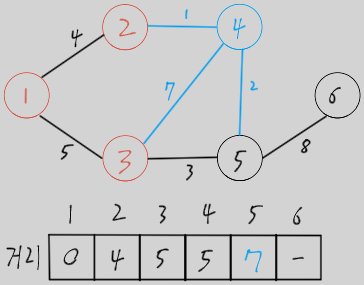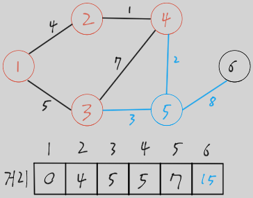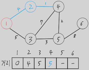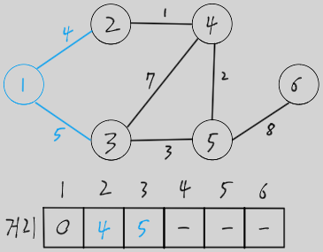 시작 노드에서 갈 수 있는 노드들의 거리를 갱신 (현재 선택된 노드와 에지는 파란색으로 표시)