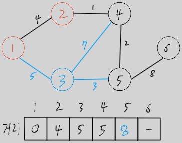 - 아직 방문하지 않은 노드 중 가장 가중치가 작은 노드 방문