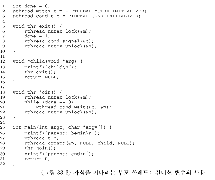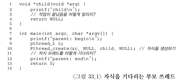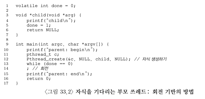 이를 위해 그림 33.2에서처럼 공유 변수를 사용할 수도 있다. 이 방법은 제대로 동작하지만 부모 쓰레드가 회전을 하면서 CPU 시간을 낭비하기 때문에 비효율적이다. 이 방법 대신에 부모 쓰레드가 특정 조건에 참이 될 때까지 (ex: 자식 쓰레드가 실행이 종료되는 것) 잠자면서 기다리는 방법이 더 좋다.