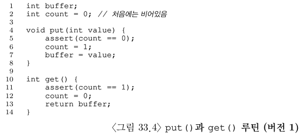 간단하게 put() 루틴은 버퍼가 비어 있다고 가정하고, 값을 공유 버퍼 넣은 후에 count를 1로 설정하여 가득 찼다고 표시한다. get() 루틴은 그 반대로 동작하는데, 버퍼가 찼는지 확인하고, 값을 꺼낸 후 버퍼가 비었다고 설정하고 읽은 값은 리턴한다. 나중에 여러 값을 저장할 수 있는 큐로 일반화할 것이니 공유 버퍼에 숫자 한 개만 저장할 수 있다고 걱정하지 말자.