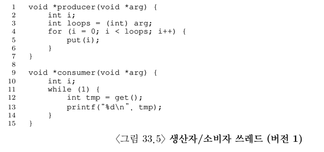 이 작업은 두 종류의 쓰레드에 의해 수행될 것이다. 하나는 생산자 쓰레드들이고 다른 하나는 소비자 쓰레드들이다. 그림 33.5는 생산자가 loop 횟수만큼 공유 버퍼에 정수를 넣고, 소비자는 무한히 데이터를 공유 버퍼에서 꺼내는 코드를 나타낸다. 소비자 쓰레드는 데이터를 공유 버퍼에서 꺼낼 때 그 값을 매번 출력한다. 이 코드게 재대로 동작하지 않는다는 것쯤은 다 알 것이다.