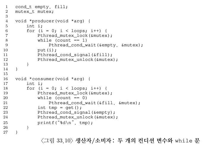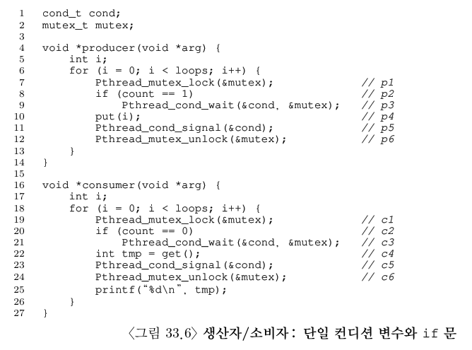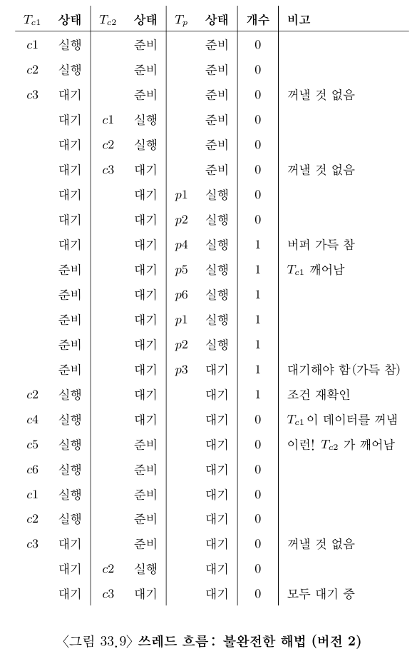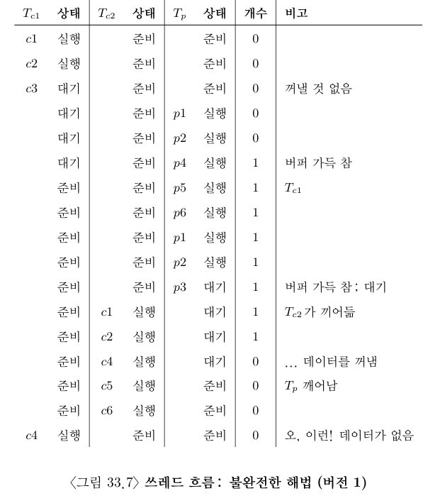 생산자와 소비자가 각 하나씩인 경우에 그림 33.6의 코드는 동작한다. 하지만 두 개 이상의 같은 종류의 쓰레드가 있다면 이런 해법에는 두 가지 문제가 있다.