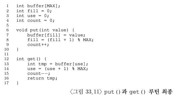 생산자와 소비자가 각 하나씩 있다고 가정한다. 당연히 put()과 get() 루틴에는 임계 영역이 있으며, put()은 버퍼를 갱신하고 get()은 버퍼에서 읽는다. 코드에 락의 추가만으로 제대로 동작하는 것은 아니고 컨디션 변수가 필요하다. 그림 33.6에서 cond 컨디션 변수 하나와 그것과 연결된 mutex 락을 사용한다.