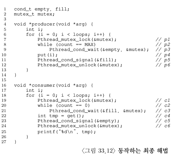 그림 33.11에서와 같이 첫 번째는 버퍼 구조와 put()과 get()을 변경하는 것이다. 생산자와 소비자가 대기 상태가 되는지에 대한 여부를 결정하는 조건도 약간 변경하였다. 그림 33.12에서 최종적인 대기와 시그널에 대한 논리를 나타내었다. 생산자는 모든 버퍼가 현재 가득 차있다면 대기 상태로 들어가고, 마찬가지로, 소비자도 모든 버퍼가 비어 있다면 대기에 들어간다. 이렇게 생산자/소비자 문제를 해결하였다.
