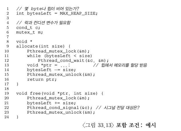 이번에는 컨디션 변수의 사용 예를 하나 살펴보자. MEsa semantic을 처음 구현했던 연구 그룹에서 직면했던 문제는 멀티 쓰레드 기반 메모리 할당 라이브러리의 예제로 가장 잘 설명될 수 있다. 그림 33.13에 이 이슈를 나타내는 예제를 보였다.
