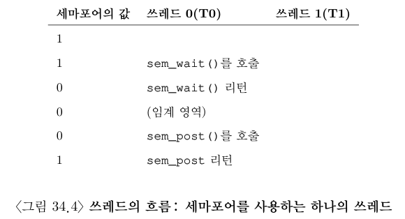 세마포어는 정수 값을 갖는 객체로서 두 개의 루틴으로 조작할 수 있다. POSIX 표준에서 이 두 개의 루틴은 sem_wait()와 sem_post()이다. 세마포어는 초기값에 의해 동작이 결정되기 때문에, 사용하기 전 “제일 먼저” 값을 초기화를 해야 한다.