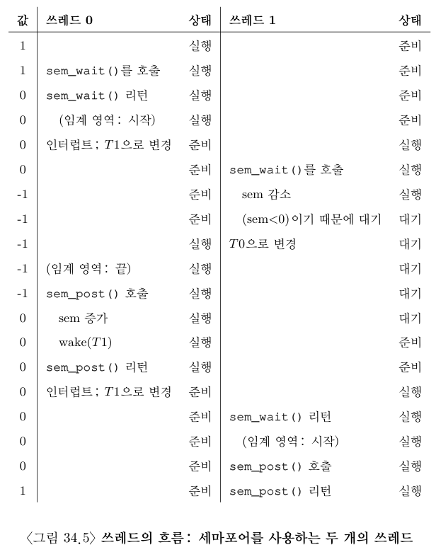 이 부분을 분명하게 하기 위해 쓰레드가 두 개인 경우를 생각해 보자. 첫 쓰레드가 sem_wait()를 호출하여 세마포어 값을 1 감소시켜 0을 만든다.
