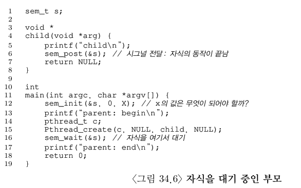 세마포어를 이용하여 어떻게 이 효과를 만들 수 있을까? 답은 의외로 간단하다. 코드에서 볼 수 있듯이, 부모 프로세스는 자식 프로세스 생성 후 sem_wait()를 호출하여 자식의 종료를 대기한다. 자식은 sem_post()를 호출하여 종료되었음을 알린다. 그렇다면 세마포어 값을 무엇으로 초기화할까?