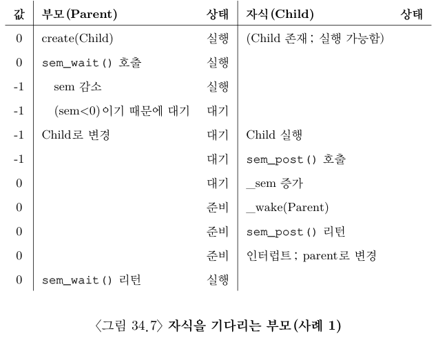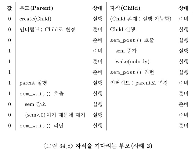 두 번째, 부모 프로세스가 sem_wait()를 호출하기 전에 자식 프로세스의 실행이 종료된 경우이다. 이 경우 자식이 먼저 sem_post()를 호출하여 세마포어의 값을 0에서 1로 증기시킨다. 부모가 실행할 수 있는 상황이 되면 sem_wait()를 호출하여 세마포어 값이 1인 것을 발견하고, 0으로 감소시켜 sem_wait()에서 대기 없이 리턴한다. 이 방법 역시 의도한 결과를 만들어 낸다.