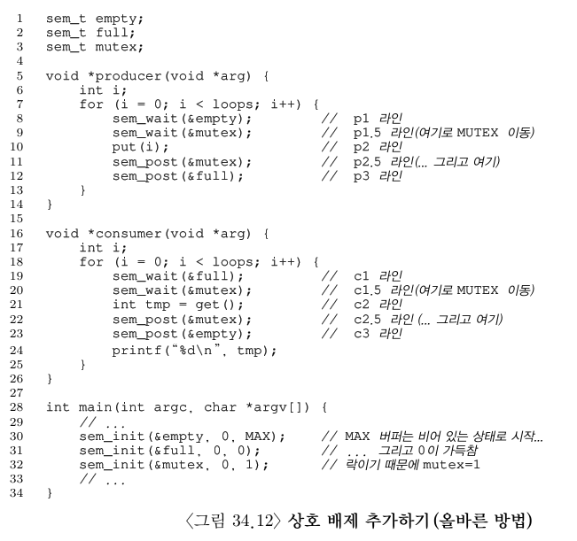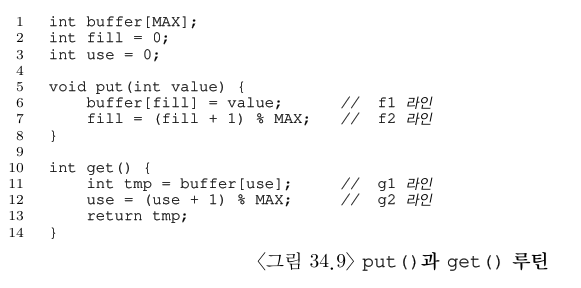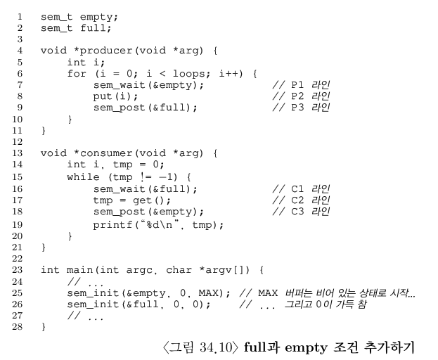 이 문제를 해결하는 첫 번째 시도에서는 empty와 full이라는 두 개의 세마포어를 사용한다. 쓰레드는 empty와 full을 사용하여 버퍼 공간이 비었는지 채워졌는지를 표시한다. put()과 get() 코드는 그림 34.9에 나타내었고 생산자와 소비자 문제를 해결하기 위해 시도한 해법은 그림 32.10에 나타내었다.