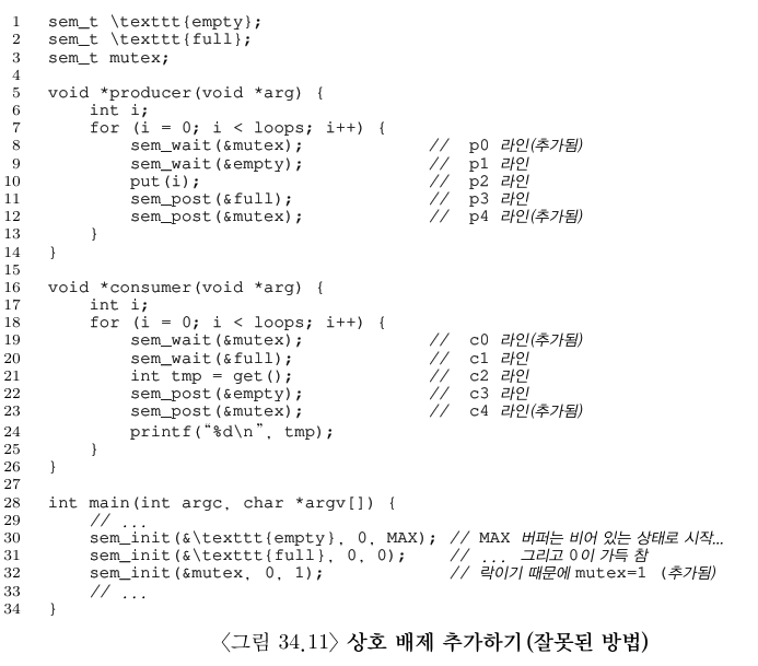 생산자가 실행되고 실행이 가능하면 데이터를 생성하고 소비자 쓰레드를 깨울 것이다. 불행하게도 이 쓰레드는 먼저 mutex 세마포어에 대해서 sem_wait()를 실행한다. 이미 락은 소비자가 획득한 상태이기 때문에 생산자 역시 대기에 들어간다.