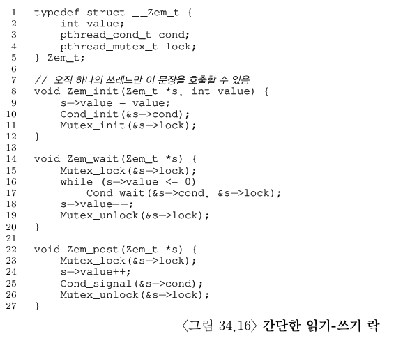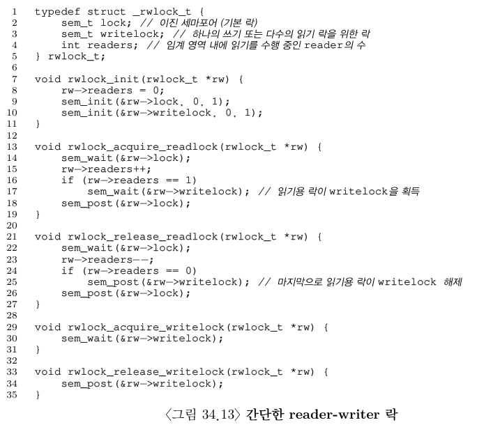 또 하나의 고전적인 문제가 있다. 다양한 자료 구조를 접근하는 데 여러 종류의 락 기법이 필요하다. 리스트에 삽입하고 간단한 검색을 하는 것과 같은 병행연산이 여러 개 있다고 해 보자. 삽입 연산은 리스트의 상태를 변경하고 검색은 자료 구조를 단순히 읽기만 한다. 삽입 연산이 없다는 보장만 된다면 다수의 검색 작업을 동시에 수행할 수 있다. 이와 같은 경우를 위해 만들어진 락이 reader-writer 락이다. 이 락에 대한 코드는 아래 그림에 나타나 있다.