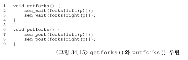 이 문제를 해결하기 위한 첫 번째 시도를 해 보자. forks 배열에 있는 각 포크에 대한 세마포어를 1로 초기화를 하였고 각 철학자는 자신의 순번(p)을 알고 있다고 가정하자. 아래 그림과 같이 getforks()와 putforks() 루틴을 작성할 수 있다.