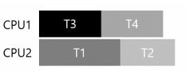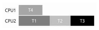 보는 바와 같이 정적 스케줄링은 T1, T2, T3가 모두 한 프로세서에서 실행되도록 보수적인 방법을 택하기 때문에 전체 작업이 끝나기까지 상당히 오랜 시간이 소요된다. 병행이 가능할 수도 있겠지만, 교착 상태가 발생할 수 있기 때문에 그렇게 할 수 없으며, 어쩔 수 없이 성능 하락을 수반한다.