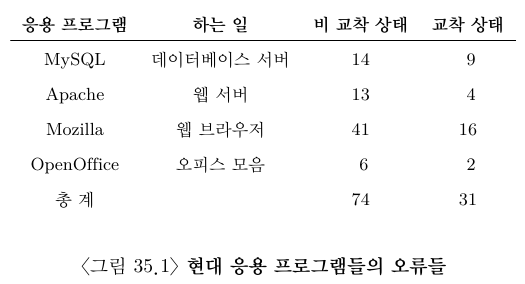 아래 그림은 Lu와 그 동룓르이 정리한 오류의 통계이다. 그림에서 보는 바와 같이 총 105개의 오류가 있고 74개의 오류는 교착 상태와 무관한 오류였다.