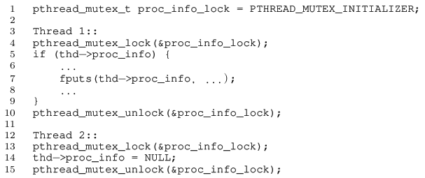 이 예제에서 thd 자료 구조의 proc_info 필드를 두 개의 다른 쓰레드가 접근한다. 첫 번째 쓰레드는 그 값이 NULL인지 검사하고 값을 출력한다. 두 번째 쓰레드는 값을 NULL로 설정한다. 첫 번째 쓰레드가 검사를 완료한 후 fputs를 호출하기 전에 인터럽트로 인해서 두 번째 쓰레드가 그 사이에 실행될 수가 있다. 두 번째 쓰레드가 실행되면 필드의 값을 NULL로 설정하기 때문에 fputs 함수는 NULL 포인터 역참조를 하게 되어 프로그램은 크래시될 것이다.