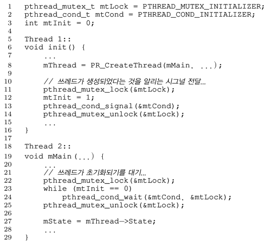수정된 코드에서는 mtLock이라는 락, 그에 대한 컨디션 변수 mtCond, 그리고 상태 변수 mtInit을 추가하였다. 초기화 코드가 실행되면 mtInit의 상태를 1로 설정하고 초기화를 완료했다고 시그널을 발생시키낟. 만약 쓰레드 2가 이 시점 전에 실행된다면 상태가 변경되기를 대기한다. 이후에 다시 쓰레드 2가 실행되면 mtInit이 1로 설정되었는지를 검사하고, 올바르게 계속 진ㅐㅇ한다. mThread 자체를 상태 변수로 사용할 수도 있겠지만 간단함을 위해서 그렇게 하지 않았다. 쓰레드 간의 순서가 문제가 된다면 컨디션 변수 또는 세마포어를 사용하여 해결할 수 있다.