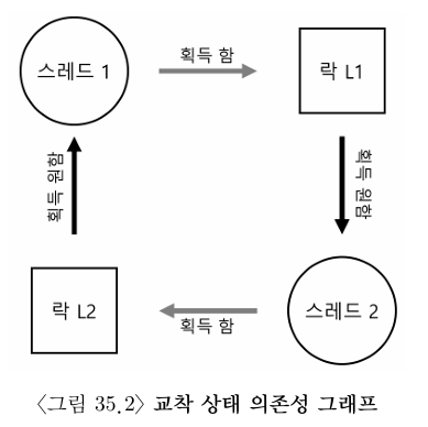 - 쓰레드 2가 락 L2를 획득하고 락 L1을 획득하려고 시도한다. -> 교착 상태 발생