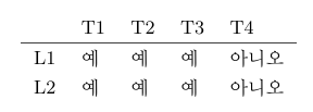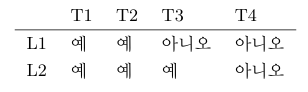 예를 들어 쓰레드 네 개가 프로세서 두 개에서 스케줄링된다고 해 보자. 그리고 추가로 쓰레드 T1이 L1과 L2 락을, T2도 L1과 L2 락을, T3는 L2를 필요로 하고, T4는 락을 필요로 하지 않는다고 가정하자. 쓰레드들의 락 요청에 대한 정보를 다음과 같이 표로 정리 해 볼 수 있다.