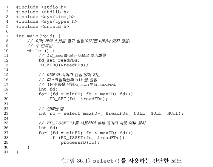 이 코드는 이해하기 쉽다. 초기화 후에 서버는 무한 루프에 들어간다. 그 루프 내에 FD_ZERO() 매크로를 사용하여 파일 디스크립터들을 초기화한 후, FD_SET()를 사용하여 minFD에서 maxFD까지의 파일 디스크립터 집합에 포함시킨다. 이 집합은 서버가 보고 있는 모든 네트워크 소켓 같은 것들을 나타낼 수 있다. 마지막으로 서버는 select()를 호출하여 데이터가 도착한 소켓이 있는지를 검사한다. 반복문 내의 FD_ISSET()를 사용하여 이벤트 서버는 어떤 디스크립터들이 준비된 데이터를 갖고 있는지를 알 수 있으며 도착하는 데이터를 처리할 수 있게 된다.