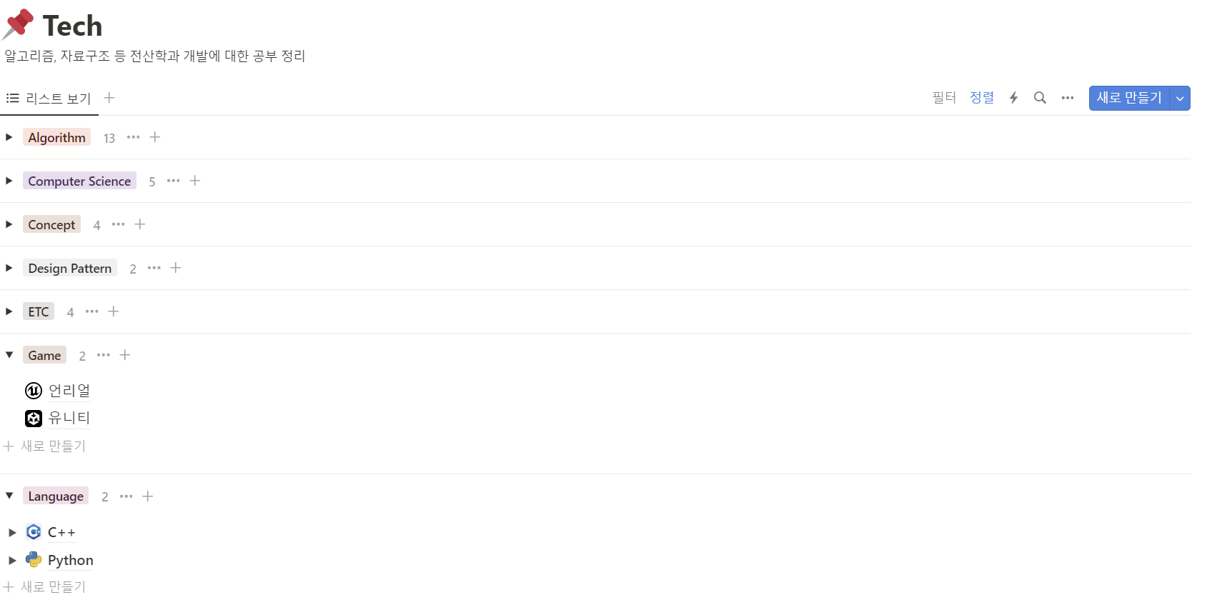 평소에 각기 다른 페이지에 학업 내용을 정리했었는데, 이걸 하나의 데이터베이스에 합치는 작업을 몇 시간 동안 했다. 카테고리 별로 나누고 속성도 달고 하니 아래와 같은 모습이 됐다.